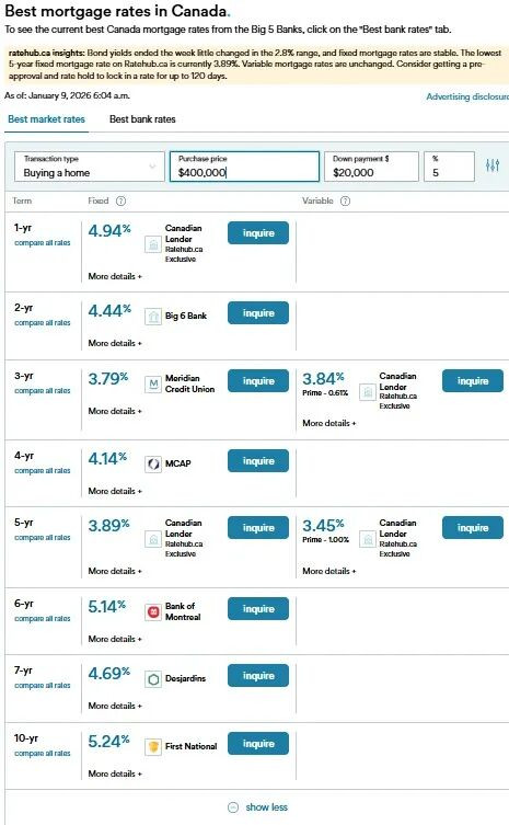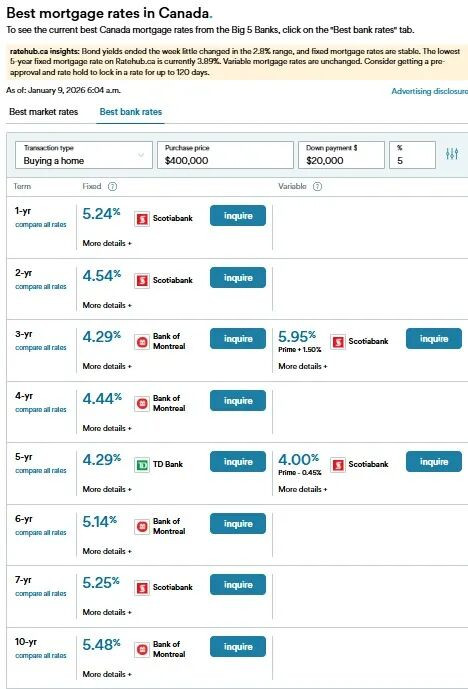 这是由Ratehub.ca: https://www.ratehub.ca/best-mortgage-rates网站提供的截止昨天1月9号加拿大银行的最佳按揭利率