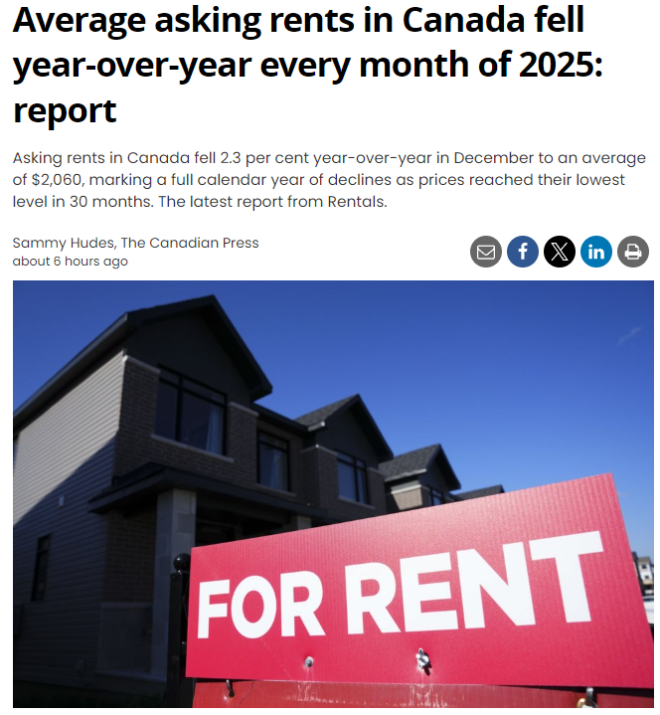 如果拉长到全年看,2025年加拿大全年平均要价房租下降了3.1%,不仅延续了下行趋势,跌幅甚至超过了新冠疫情期间的年度降幅。