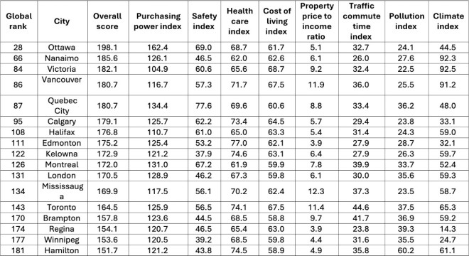 他补充说,在这项新的生活质量研究中,渥太华在几乎所有指标上都获得了很高评分,包括:安全、生活成本、购买力、通勤时间、空气质量,以及房价与收入比。
