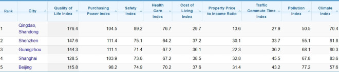 该调查评估了全球304个城市的生活质量,参考因素包括: