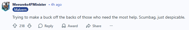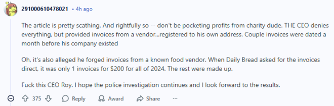 “这篇文章写得相当尖锐。理应如此——别从慈善中牟利啊,伙计…F***CEO罗伊。我希望警方继续调查,期待调查结果。”