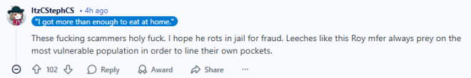 “这帮该死的骗子,真TM绝了。我真希望这货因为诈骗在牢里待到烂掉。像Roy这种人渣吸血鬼,永远都在欺负那些最无助的弱势群体,就为了填满他自己的腰包。”