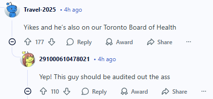 “他居然还是我们多伦多卫生局董事会成员。”——“这家伙应该接受彻底的审计。”