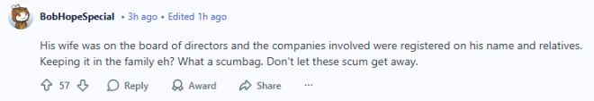 “他老婆竟然还在董事会里,而且涉案的那几家公司全是注册在他自己和亲戚名下的。好家伙,全家总动员‘肥水不流外人田’是吧?真是个人渣。千万别让这帮败类给溜了。”