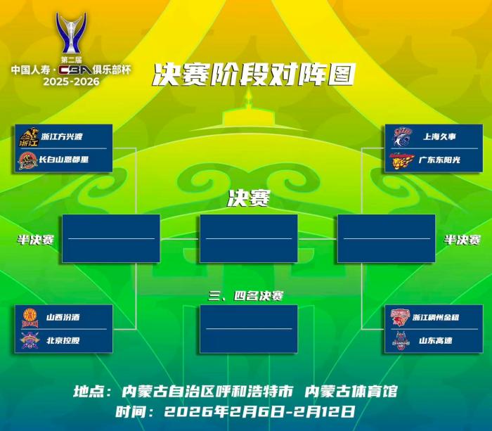 1月13日电 根据赛程,第二届中国人寿·CBA俱乐部杯决赛阶段比赛将于2月6日至12日在呼和浩特举行,相关赛程已于日前出炉。