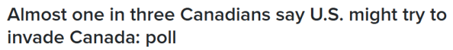民调结果显示,许多加拿大人认为,美国未来很可能会试图控制其他国家,包括格陵兰、古巴、哥伦比亚、巴拿马、伊朗,以及加拿大。