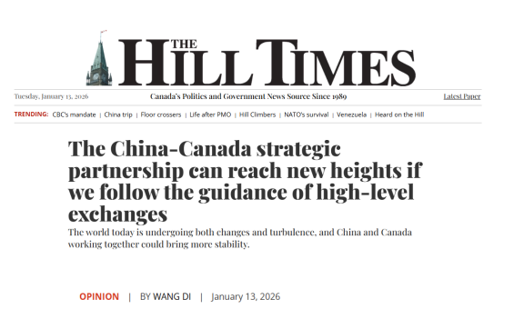 026年1月13日,驻加拿大大使王镝在加媒体《国会山时报》发表署名文章《以高层交往为引领 推动中加战略伙伴关系迈上新台阶》。全文如下: