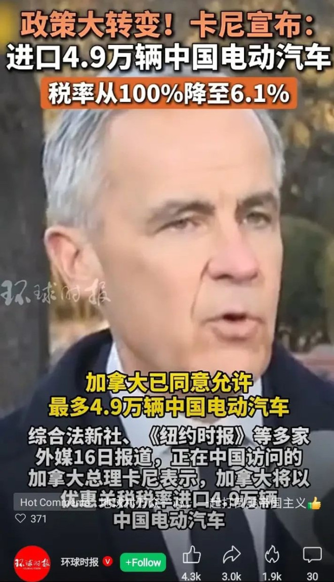 涉中国电动汽车,加拿大总理卡尼宣布大消息