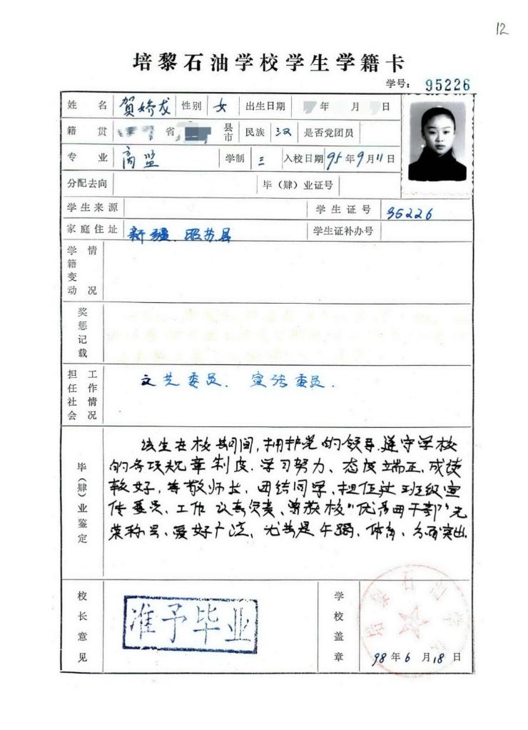 1998年夏,贺娇龙从原培黎石油学校(现兰州城市学院)毕业了。学号95226——这个印在泛黄学籍卡上的数字,静静地放置在母校的档案里,保留着她的青春印记。