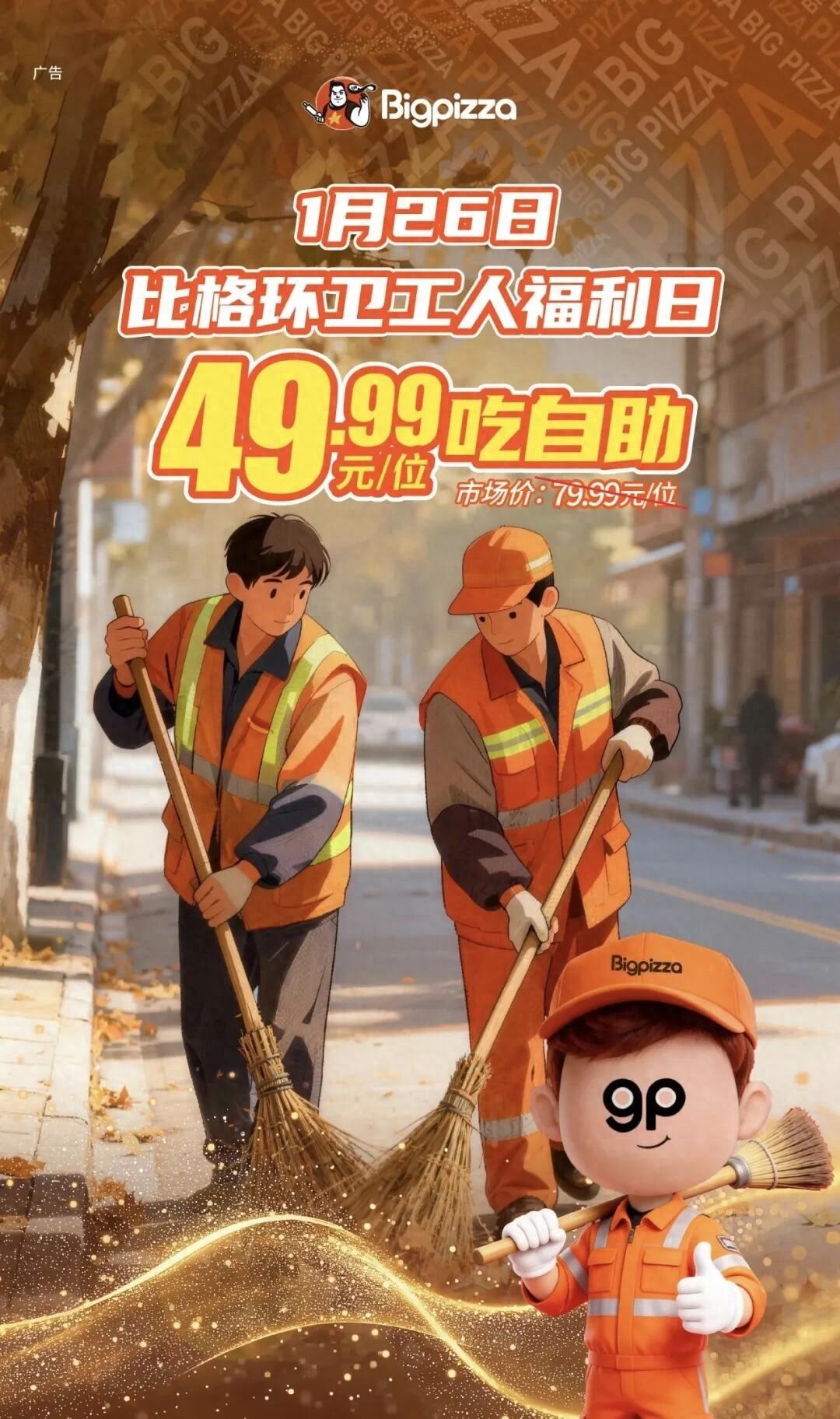 近日,比格比萨推出“环卫工人49.99元吃自助”福利日活动,引发热议。