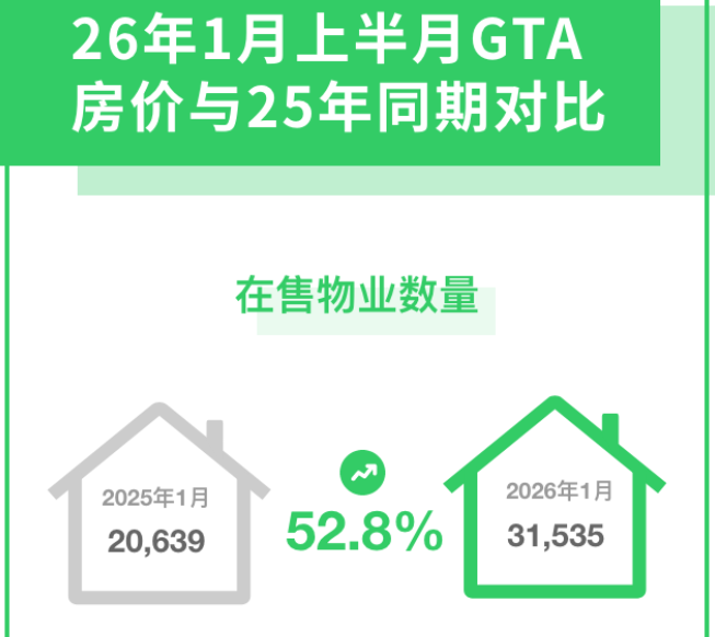 根据51找房统计数据显示,1月上半月大多伦多在售物业数量31535套,比去年同期的20639套,增加51%。
