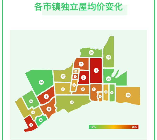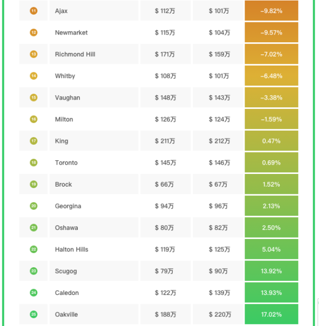 位居涨幅榜第一名的是Oakville,涨幅17%,其后是Caledon和Scugog,涨幅均为14%。