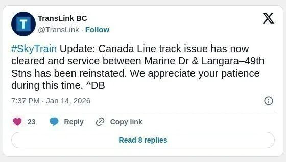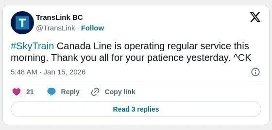 技术问题解决后,Translink在晚上7:37表示,加拿大线轨道问题现已解决,天车服务已经恢复正常。