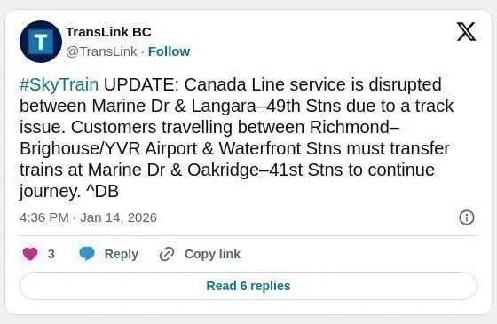 Translink当时表示,出现了轨道故障。故障导致加拿大线Marine Dr站和Langara-49th站之间的服务中断。