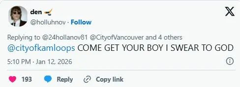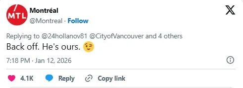 面对这场“炽热城市对决”,温哥华市政府也亲自下场回应,语气相当官方又带点凡尔赛:“我们注意到渥太华和蒙特利尔正在争论谁拥有 Shane Hollander。但需要提醒大家,现实中的哈德森·威廉姆斯是一位温哥华人,我们对此非常自豪。至于虚构角色的归属,就交给他们去争吧”。