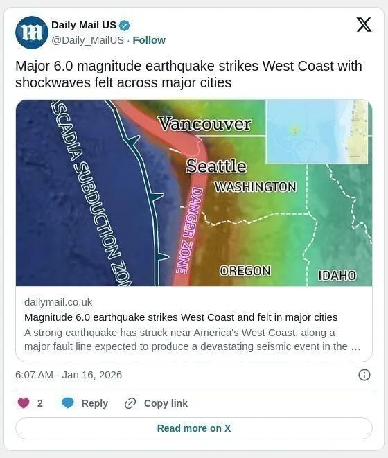 西海岸时间周四(1月15号)晚间,俄勒冈州近海发生6.0级,震中位于太平洋,距海岸约180英里(约290公里)。此次地震的震感波及多座城市,专家预计未来几天仍可能出现余震。