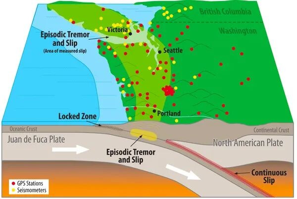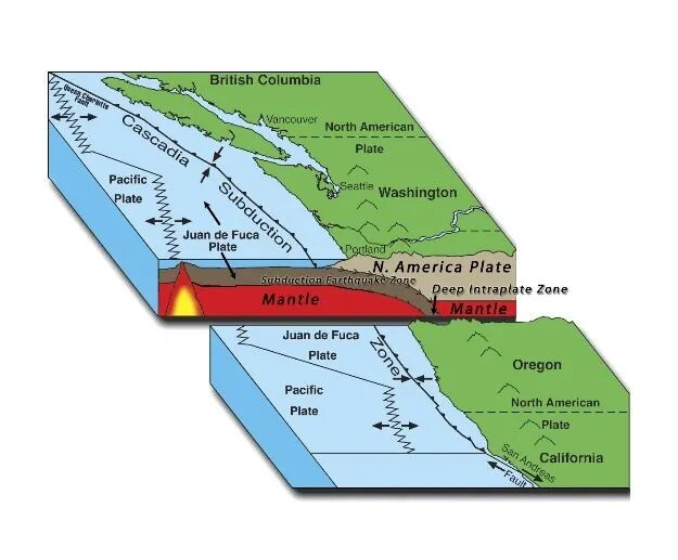 本次地震发生在胡安·德富卡板块(Juan de Fuca Plate),该板块推动卡斯卡迪亚俯冲带(Cascadia Subduction Zone,CSZ)——北美西海岸近700英里长的断层。