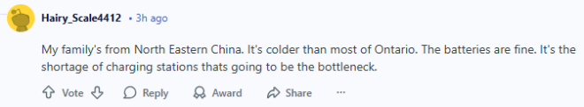 我家来自中国东北。那里比安大略省大部分地区都冷。电池没问题。真正的瓶颈在于充电站的短缺。