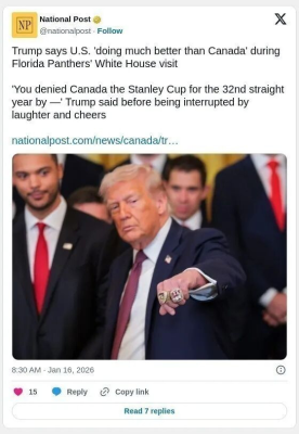 特朗普在受到熱烈掌聲後繼續說道:“我們和加拿大有點小競爭。雖然他們是偉大的人,但沒關係,我們做得比加拿大更好,對吧?我們希望他們也能做得好,他們會做得好的”。特朗普的這番話再次讓美國與加拿大的冰球競爭成為焦點。黑豹隊在上賽季的斯坦利杯決賽中擊敗了埃德蒙頓油人隊,這意味着加拿大再延續冠軍荒。自1992-93賽季蒙特利爾加拿大人隊奪冠以來,所有加拿大隊伍都未能再奪得斯坦利杯。