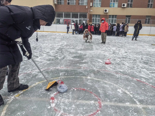 克拉玛依市第五小学师生自制“冰壶”,在校园进行比赛。克拉玛依市第五小学供图