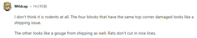 “我觉得不是老鼠咬的。那四块黄油的顶角都有相同的破损,看起来更像是运输过程中的问题。另外一处看着也像是运输造成的压痕。老鼠可啃不出那么整齐的线条。”
