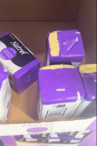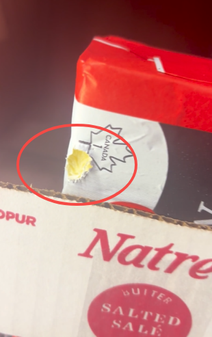 从其上传的视频来看,多个Natrel品牌有盐、无盐黄油的外包装纸以及内部黄油都被咬出不规则缺口,露出的黄油边缘痕迹看起来像是啮齿动物留下的咬痕。
