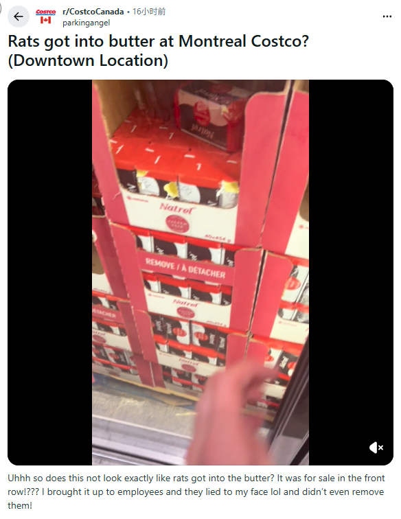 有网友在r/CostcoCanada版块发帖称,自己在蒙特利尔市中心一家Costco门店购物时,发现冰箱货架上正在出售的黄油包装出现明显破损,疑似被老鼠啃咬,甚至能直接看到黄油本体外露。