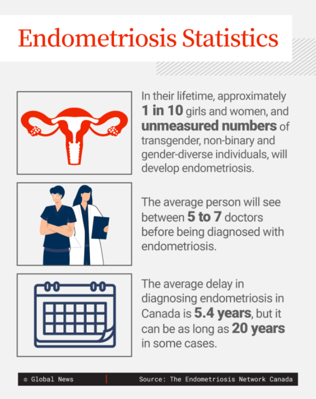 加拿大子宫内膜异位症网络(Endometriosis Network Canada)指出,在加拿大,从出现症状到确诊的平均延误时间为 5 年半。
