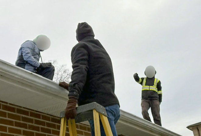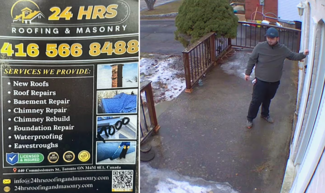 Bentley一家向CTV新闻提供的监控视频中,可以看到Bentley把钱交给的那名男子。对方自称来自一家名为“24 Hrs Roofing and Masonry”的公司。