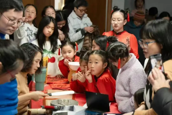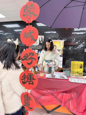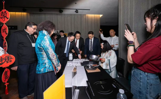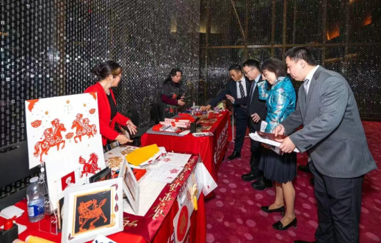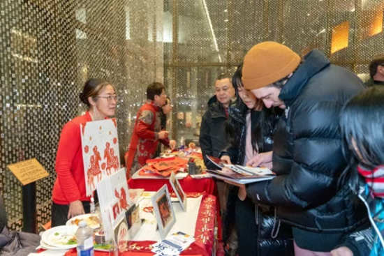 晚會啟幕之前,劇場公共空間已化作一條層次分明、動靜相生的文化長廊,集中呈現中華文脈在海外的當代表達。墨楓書畫老師墨楓現場呈現民間糖畫展演,以融糖為筆、轉腕成形,在火候與線條的精準把控中勾勒出生動靈巧的傳統意象,讓觀眾近距離感受非遺技藝的靈動與溫度;與之相映成趣的,是書畫藝術所承載的靜穆氣韻,墨韻生香、筆走龍蛇,一筆一畫間蘊藏漢字之美與文脈之深,一動一靜之間,盡顯中華傳統藝術的多重審美層次。手工藝展區同樣精彩紛呈,剪紙紅影翻飛,剪出民俗記憶與歲月溫情;疊紙作品層層展開、形態萬千,將民間智慧凝於指尖,讓吉祥紋樣躍然眼前。