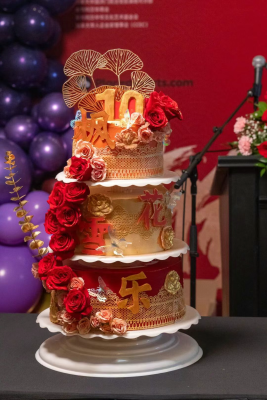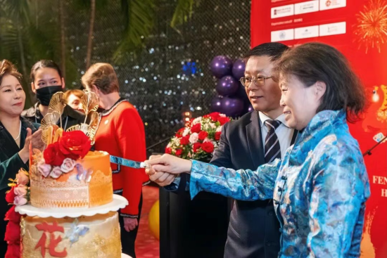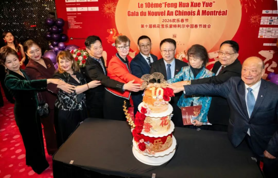 致辭結束後,中國駐蒙特利爾總領事戴玉明先生在現場引領下,與晚會共同主席榮萌女士、郭俊先生及多位致辭嘉賓共同登台,攜手為第十屆楓花雪樂蒙特利爾中國春節晚會切下象征十載華章的慶典蛋糕。三層蛋糕以中國紅與鎏金為主色,點綴“十”字及“楓花雪樂”標識,寓意十年堅守、一路同行。莊重而溫馨的儀式中,掌聲與祝福交織,既是對楓花雪樂十年發展歷程的深情回望,也彰顯了在總領館大力支持和共同主席統籌推動下,社會各界攜手同行、共啟未來的新起點。