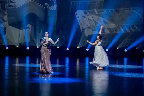 加拿大著名女高音歌唱家 趙禹涵 獨唱,北美文學和藝術家聯合總會(北美文聯)藝術團舞蹈總監 許可 獨舞的歌曲《感恩》,歌聲溫潤真摯、清澈明亮、從容大氣。許可作為北美文聯藝術團的舞蹈總監,以舒展而富有韻律的舞姿,與歌聲相互呼應、彼此映襯,在舞台上娓娓鋪展真摯而深沈的情感,深情抒發了對歲月、陪伴與支持的感恩之情。