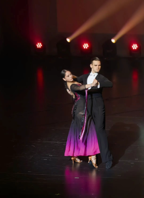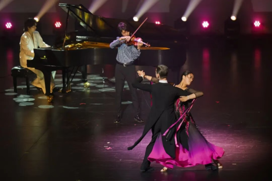 由 北美文學和藝術家聯合總會 愛樂團 呈現的探戈舞《一步之遙》,以三冠同台、跨界共舞成為全場亮點。作品集結三位來自不同領域的加拿大冠軍藝術家同台綻放——加拿大小提琴冠軍 Aiden、加拿大鋼琴冠軍 Lawrence He 現場合奏,攜手 2025 年度華裔小姐選美冠軍 Audrey Turcotte Miao 與搭檔 Filatov Arseniy 共舞探戈。弦樂與琴鍵牽引舞步,在“近”與“遠”的張力之間鋪陳情感博弈——那未曾相觸的咫尺,正是探戈藝術最迷人、也最恒久的靈魂距離。