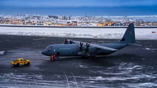 頂圖圖說:1月15日在丹麥自治領地格陵蘭島首府努克機場拍攝的一架丹麥空軍「超級大力神」運輸機。(新華社)