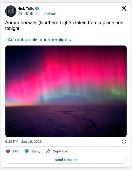 受此影响,在夜色最深的时段,北极光迷人的绿色与紫色光芒横跨北美大片地区,在天空中舞动。