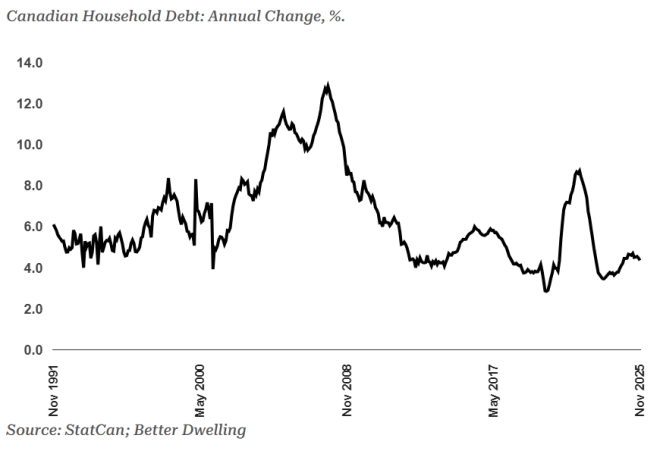 一方面,借贷通常被视为经济信心的体现:新增信贷意味着借款人和放贷方都认为,就业与收入条件足以支撑还款。用于消费的借贷也会推动经济活动,从而带来更多增长。某种程度上,这也是加拿大过去增长强劲的重要原因之一——很大程度上由信贷推动。