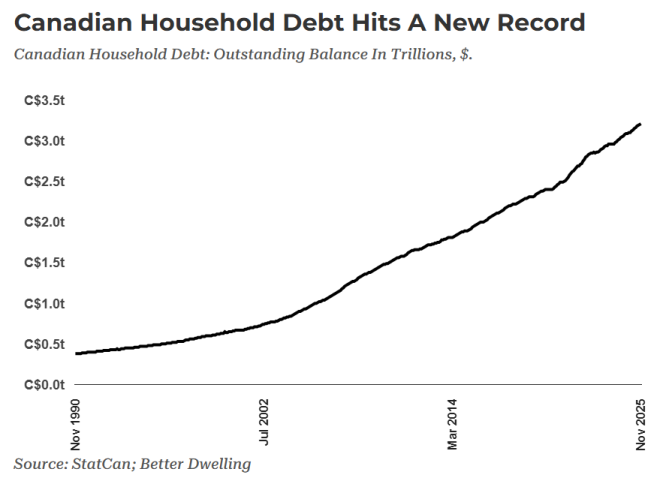 加拿大居民家庭正在不断累积债务,但这可能并非通常意义上的“信心”信号。加拿大统计局(StatCan)数据显示,家庭信贷余额在11月升至历史新高。信贷使用上升有时代表经济健康,但如果同时伴随通胀回升、借贷成本飙升,就很难解读为乐观。两者叠加呈现出的图景,更像是家庭在“勉强维持”,而不是积极消费扩张。