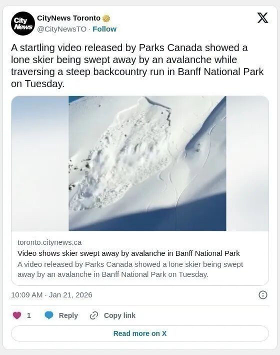 加拿大公园管理局表示,这段视频“重要地提醒我们,无论当前的危险等级如何,任何坡度超过 30 度的斜坡都可能随时发生雪崩”。