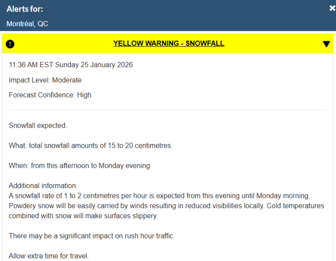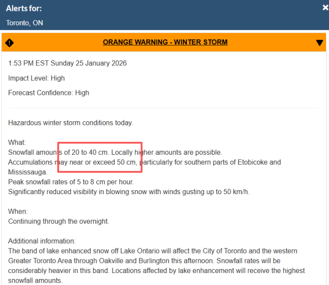 環境部預計全省將迎來約40厘米降雪,甚至可能接近或超過50厘米。漢密爾頓、倫敦、大多倫多地區和基奇納-滑鐵盧的官員呼籲居民儘量呆在家裡。