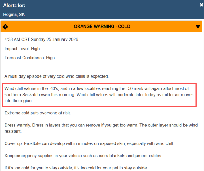 加拿大環境部對薩斯喀徹溫省大部發布了橙色警報。環境部表示,該省許多城鎮已經打破寒冷天氣紀錄——在風寒效應下,最低可達-50℃。