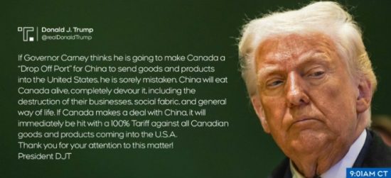周六凌晨,特朗普威脅稱,如果加拿大“與中國達成協議”,將對加拿大商品徵收100%關稅,並首次以“州長(Governor)”稱呼卡尼進行嘲諷。