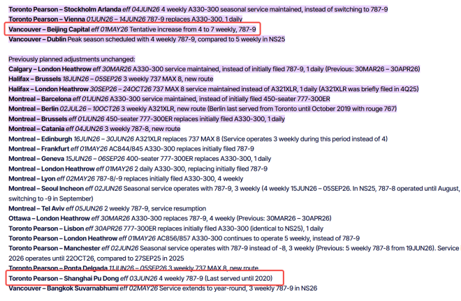 此前,加航已于2024年底至2025年初陆续将温哥华-上海航线增至每日一班,并恢复温哥华-北京每日服务。