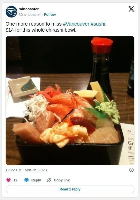 温哥华拥有世界上最棒的寿司(日本以外),而你自然乐于充分利用这一优势。你有固定的常去寿司店、特殊场合的高档选择,还有平日夜晚满足小饥饿的经济实惠店。