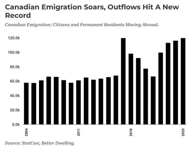 事實上,加拿大的人口外流已經持續增長多年。按照統計局每年7月1日的年度估算,2025年共有120.016人離開加拿大,比前一年增長3.0%,也是連續第四年上升。和十年前相比,這一數字幾乎翻了一倍,增長速度甚至有可能在今年超過人口自然增長率。