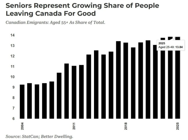 那至少老年人還留在加拿大,對吧?現實可能沒那麼樂觀。事實上,老年人口的外流同樣出現了明顯的結構性變化。數據顯示,2025年共有16.609名55歲及以上的加拿大人永久離境,同比增長3.0%,比十年前高出整整80.5%。