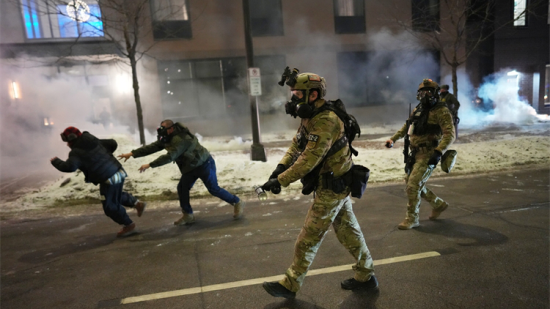 頂圖圖說:1月25日,在美國明尼蘇達州明尼阿波利斯市,聯邦執法人員驅離抗議者。
