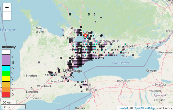 超过2,300名居民报告感受到震动,范围从多伦多、汉密尔顿,一直到Belleville、Kingston,甚至远至渥太华。