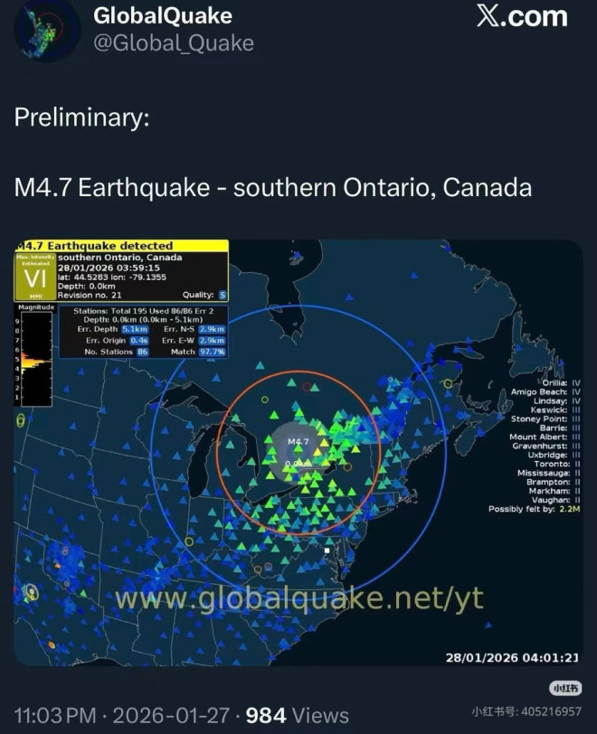 加拿大地震监测机构(Earthquakes Canada)确认,地震发生在晚上11点前,震中位于 Ramara,距离Orillia以东23公里,约在多伦多以北 100公里处,震源深度约5公里。