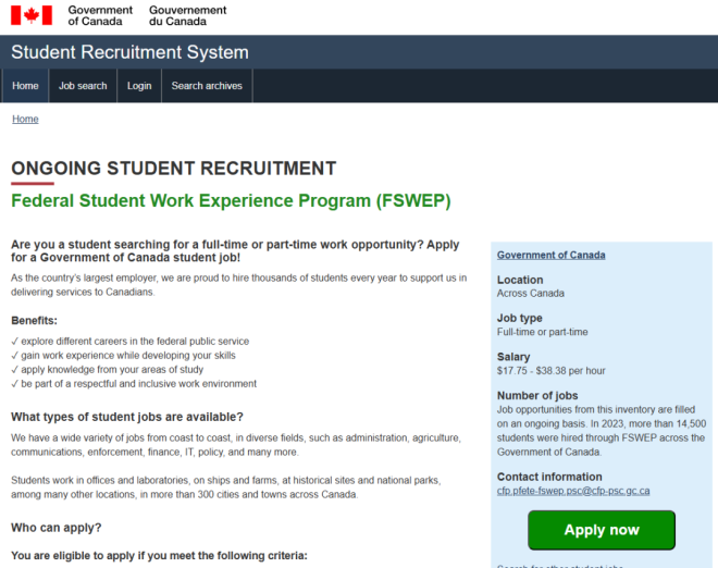 加拿大政府招聘学生工: 时薪高达$38! 高中生到博士都可申请
