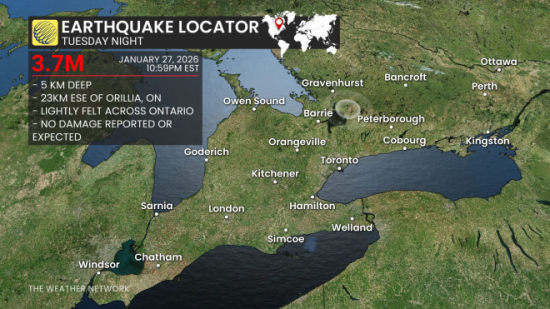 加拿大地震監測機構(Earthquakes Canada)確認,地震發生在晚上11點前,震中位於 Ramara,距離Orillia以東23公里,約在多倫多以北 100公里處,震源深度約5公里。